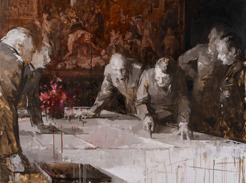 Front is a long-term painting project delving into collective memories of World War II. The project evolved from a single photograph taken shortly after the fall of Nazi Germany. In this photo, my great-grandfather is seen standing among Soviet soldiers in the midst of the ruins of the Reich Chancellery in Berlin. A painting I made after this image to evoke the predicament of one man in June 1945, gradually evolved into a series exploring the era and its shadows. The works also aspire to express the human conditions that haunt us to this day, whether as memories of the past or as the results of current dramas. By exhuming experiences of a distant war, I aim to confront the darker corners of the human psyche which can emerge at any time, wearing any uniform.